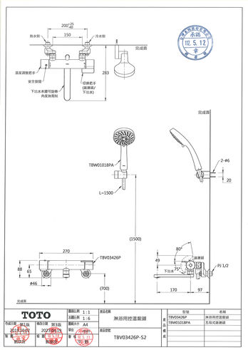 【TOTO】淋浴用控溫龍頭 TBV03426P-S2 五段式蓮蓬頭(省水標章、安心觸、SMA控溫技術)