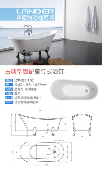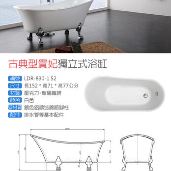聯德爾《LDR-830-1.52》古典型貴妃獨立式浴缸152公分