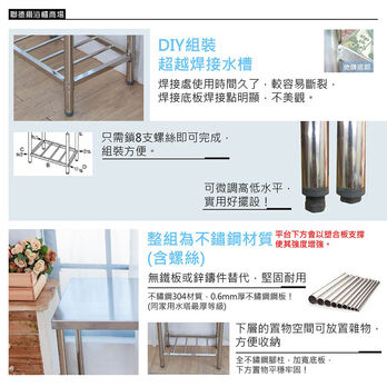 - 設有調整腳座,可依需求微調水槽高度及水平