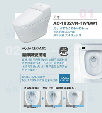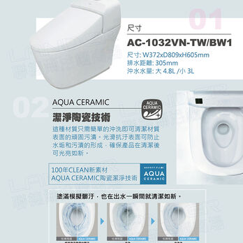 【INAX】單體馬桶AC-1032VN-TW-BW1(潔淨陶瓷技術、雙漩渦沖水、緩降便座、金級省水)