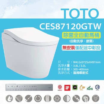 【TOTO】除菌全自動馬桶CES87120GTW(電解除菌水、自動掀蓋、洗淨)