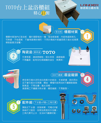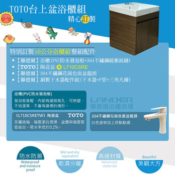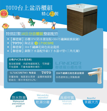 【TOTO】深咖啡浴櫃組50公分-TOTO-L710CSRETW-C+50公分鏡櫃(盆+櫃+304不鏽鋼龍頭+下水器配件組+鏡櫃)《TP-48D-710CSR-C》 1500027000立即購買商品特色TOTO陶瓷表面採抗污釉技術鏡子+櫃子收納二合一產品敘述所有商品INAX伊奈LG人造石Panasonic國際牌TOTO系列TOTO馬桶TOTO面盆(壁掛、下崁)TOTO壁掛小便斗TOTO浴櫃組TOTO龍頭組、溫控淋浴浴櫃組掛壁式浴櫃組(吊櫃)HCG浴櫃組落地式浴櫃組(立櫃)其它檯上洗臉盆陶瓷檯上洗臉盆玻璃檯上洗臉盆水龍頭廚房用龍頭面盆用龍頭沐浴用龍頭其它鏡組獨立式浴缸水槽水槽面陽洗台洗衣水槽不鏽鋼工作平台馬桶其它用品浴室配件安全扶手其它掛勾DAY&DAY出清/展示/瑕疵