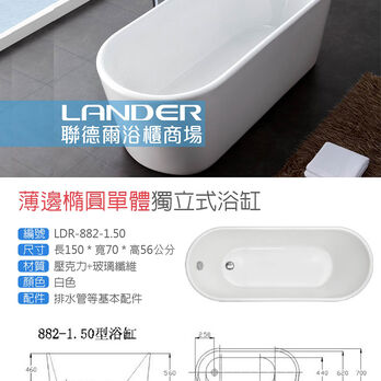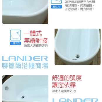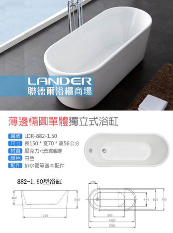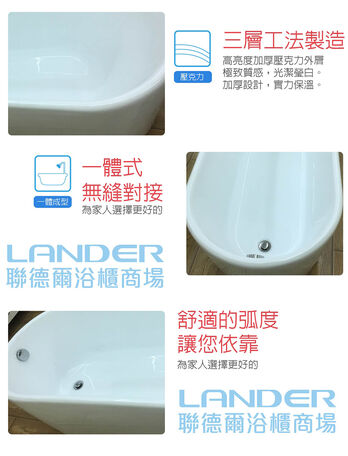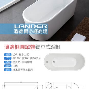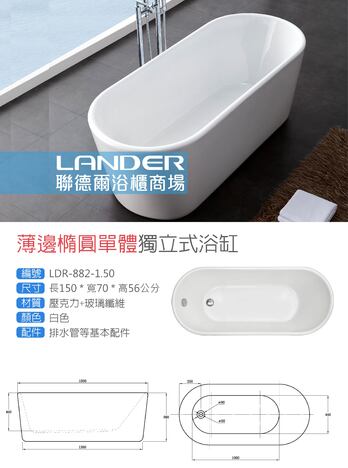 ★輕巧耐用,具光澤感,質地輕盈,不易卡垢好清理 ★獨立浴缸不需砌牆、不必固定在牆面,造型簡潔優雅 ★極簡風格,獨具特色,展現衛浴間的視野與寬敞度 運費: 其他縣市請來電洽詢,另行報價 購買前請參閱本網站之『安裝保養』以及『付款方式』的注意事項 表層使用光滑堅硬的壓克力,內層使用堅固質輕的玻璃纖維 浴缸下面設有調整腳座,可依需求調整浴缸水平,重心穩固,安全性佳 符合人體工學設計,易達到浸泡的效果,增進泡澡新享受 獨立式浴缸不需砌牆、不必固定在牆面,造型簡潔優雅,設置相對於簡單容易 可以隨心所欲的安置擺設,讓設計不侷限於環境的限制 要更換也比無牆浴缸容易很多 商品內含排水管等配件(不含獨立式龍頭) 規格:長150 * 寬70 * 高56公分 材質:壓克力+玻璃纖維 顏色:白色 配件:排水管等基本配件 貼心小提醒: ★ 請勿讓孩童、老人或身障人士單獨入浴,請務必由照護者陪同入浴, 以免導致溺水或燙傷、受傷等意外 ★ 出入浴之際,請扶住浴缸邊緣等處,以免因濕滑導致跌倒受傷 ★ 請勿將熱水直接注入浴缸內,若直接讓超過85度的熱水接觸浴缸表面, 可能導致浴缸表面損傷。請先儲存少量冷水後再注入熱水,請勿過度加熱, 若反覆過度加熱,恐導致浴缸受損,縮短浴缸使用壽命 ★ 請勿使用含有硫黃、鹽分及酸性成分的入浴劑或溫泉水,可能導致浴缸 變色、配管、幫浦等損傷而縮短使用壽命,其他入浴劑,請詳細閱讀入浴劑 使用說明書後正確使用。 ★ 避免使用深色的清潔劑,因容易引致色素滲入缸面 ★ 清洗浴缸時嚴禁強酸、強鹼或帶腐蝕性的清潔劑,避免傷害表面如釉料等, 恐造成凹凸不平,有刮傷皮膚或滲水風險,建議用中性清潔劑加乾布擦拭, 即可去除表面水漬等污垢,若表面有裂痕,最好馬上更換或避免使用 ★ 浴缸可用海棉或濕布順手做好清潔,以免汙垢囤積不易清洗, 特別注意 請不要用硬質刷子或是粗糙的菜瓜布,避免造成浴缸表面磨損 如因尺寸不合、顏色不喜歡、門框無法進入等個人因素問題要退貨,需自行負擔退貨單趟運費,台中500元,外縣市1000元。