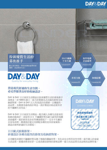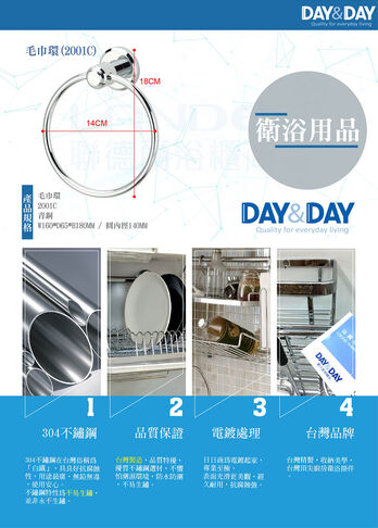DAY & DAY 《2001C》毛巾環600750立即購買產品敘述品名:毛巾環貨號:2001C材質:青銅尺寸:W160*D65*H180MM / 圓內徑140MM所有商品INAX伊奈LG人造石Panasonic國際牌TOTO系列TOTO馬桶TOTO面盆(壁掛、下崁)TOTO壁掛小便斗TOTO浴櫃組TOTO龍頭組、溫控淋浴浴櫃組掛壁式浴櫃組(吊櫃)HCG浴櫃組落地式浴櫃組(立櫃)其它檯上洗臉盆陶瓷檯上洗臉盆玻璃檯上洗臉盆水龍頭廚房用龍頭面盆用龍頭沐浴用龍頭其它鏡組獨立式浴缸水槽水槽面陽洗台洗衣水槽不鏽鋼工作平台馬桶其它用品浴室配件安全扶手其它掛勾DAY&DAY出清/展示/瑕疵