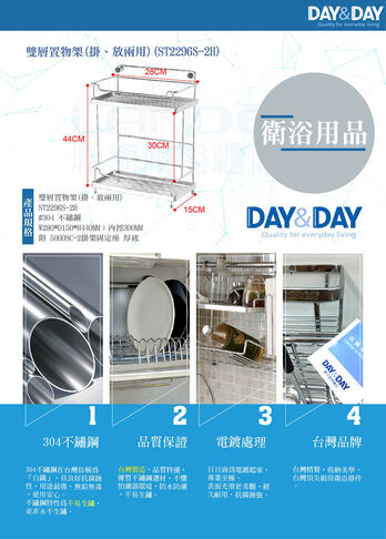 品名:雙層置物架(掛、放兩用) 貨號:ST2296S-2H 材質:#304 不鏽鋼 尺寸:W280*D150*H440MM;內徑300MM 備註:附 5000SC-2掛架固定座 厚底