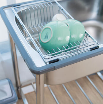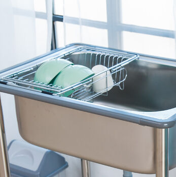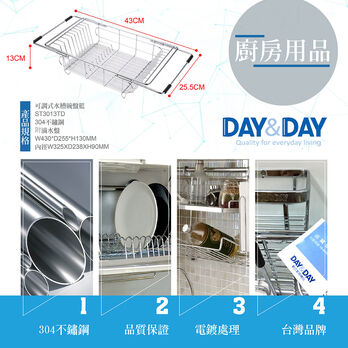 產品名稱:可調式水槽碗盤籃 產品編號:ST3013TD 產品材質:304不鏽鋼 產品規格:附滴水盤 產品尺寸:W430~545*D255*H130MM 產品內徑:W325*D238*H90MM