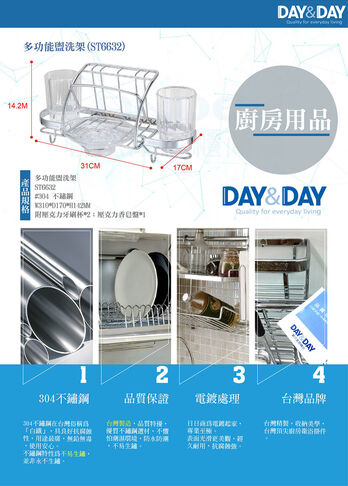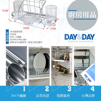 品名:多功能盥洗架 貨號:ST6632 材質:#304 不鏽鋼 尺寸:W310*D170*H142MM 備註:附壓克力牙刷杯*2;壓克力香皂盤*1