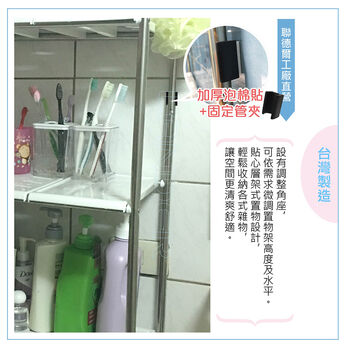 商品附有附固定牆之塑膠底座X2,組裝完成後,請把牆面擦拭乾淨,左右調整好水平,塑膠底座壓上柱子黏貼於牆面,即可固定不搖晃,可牢固於牆上。