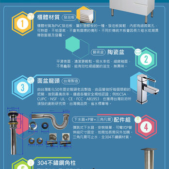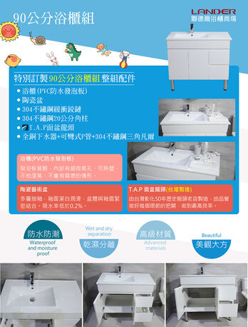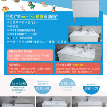 商品內容物:陶瓷盆+櫃子+龍頭+彈跳式下水器+P管+三角凡爾腳柱)